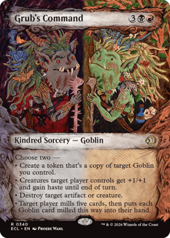 Choose two — • Create a token that's a copy of target Goblin you control. • Creatures target player controls get +1/+1 and gain haste until end of turn. • Destroy target artifact or creature. • Target player mills five cards, then puts each Goblin card milled this way into their hand.