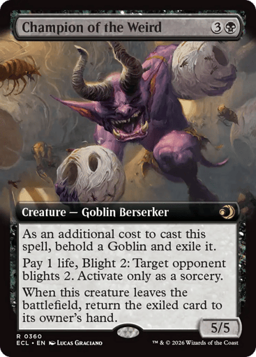 As an additional cost to cast this spell, behold a Goblin and exile it. (Exile a Goblin you control or a Goblin card from your hand.) Pay 1 life, Blight 2: Target opponent blights 2. Activate only as a sorcery. When this creature leaves the battlefield, return the exiled card to its owner's hand.