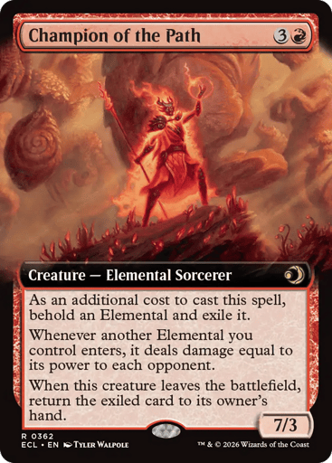 As an additional cost to cast this spell, behold an Elemental and exile it. (Exile an Elemental you control or an Elemental card from your hand.) Whenever another Elemental you control enters, it deals damage equal to its power to each opponent. When this creature leaves the battlefield, return the exiled card to its owner's hand.