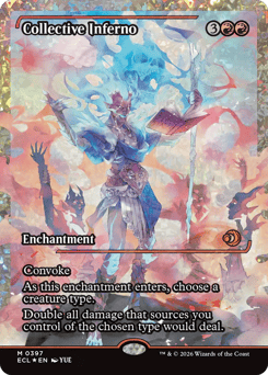 Convoke (Your creatures can help cast this spell. Each creature you tap while casting this spell pays for {1} or one mana of that creature's color.) As this enchantment enters, choose a creature type. Double all damage that sources you control of the chosen type would deal.