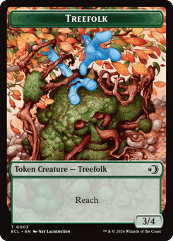 Affinity for Forests (This spell costs {1} less to cast for each Forest you control.) Landfall — Whenever a land you control enters, create a 3/4 green Treefolk creature token with reach. {1}{G}, Exile this enchantment: Treefolk and Forests you control gain indestructible until end of turn.