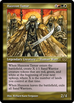 When Hazezon enters, create X 1/1 Sand Warrior creature tokens that are red, green, and white at the beginning of your next upkeep, where X is the number of lands you control at that time. When Hazezon leaves the battlefield, exile all Sand Warriors.