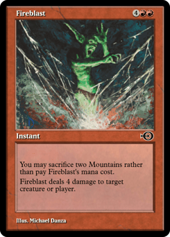 You may sacrifice two Mountains rather than pay this spell's mana cost. Fireblast deals 4 damage to any target.