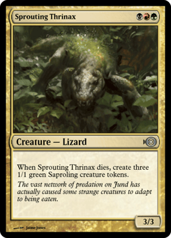 When this creature dies, create three 1/1 green Saproling creature tokens.