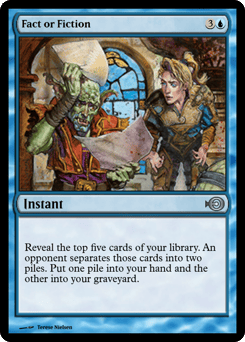 Reveal the top five cards of your library. An opponent separates those cards into two piles. Put one pile into your hand and the other into your graveyard.