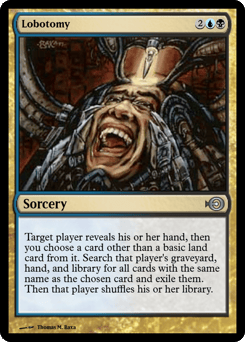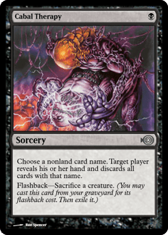 Choose a nonland card name. Target player reveals their hand and discards all cards with that name. Flashback—Sacrifice a creature. (You may cast this card from your graveyard for its flashback cost. Then exile it.)