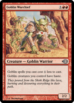 Goblin spells you cast cost {1} less to cast. Goblins you control have haste.