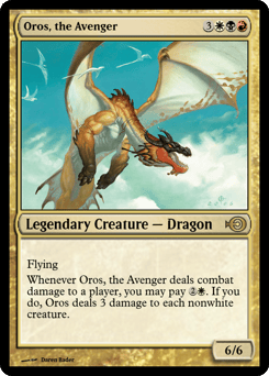 Flying Whenever Oros deals combat damage to a player, you may pay {2}{W}. If you do, Oros deals 3 damage to each nonwhite creature.