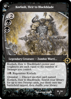 Korlash's power and toughness are each equal to the number of Swamps you control. {1}{B}: Regenerate Korlash. Grandeur — Discard another card named Korlash, Heir to Blackblade: Search your library for up to two Swamp cards, put them onto the battlefield tapped, then shuffle.