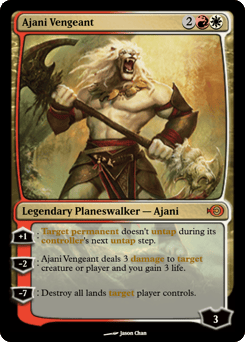 [+1]: Target permanent doesn't untap during its controller's next untap step. [−2]: Ajani deals 3 damage to any target and you gain 3 life. [−7]: Destroy all lands target player controls.