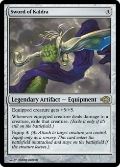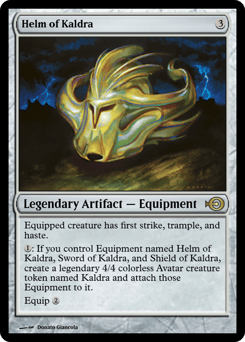Equipment named Sword of Kaldra, Shield of Kaldra, and Helm of Kaldra have indestructible. Equipped creature has indestructible. (Damage and effects that say "destroy" don't destroy it.) Equip {4}