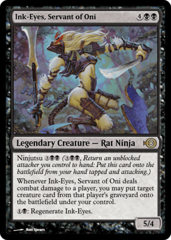 Ninjutsu {3}{B}{B} ({3}{B}{B}, Return an unblocked attacker you control to hand: Put this card onto the battlefield from your hand tapped and attacking.) Whenever Ink-Eyes deals combat damage to a player, you may put target creature card from that player's graveyard onto the battlefield under your control. {1}{B}: Regenerate Ink-Eyes.