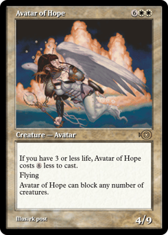 Serra Avatar's power and toughness are each equal to your life total. When Serra Avatar is put into a graveyard from anywhere, shuffle it into its owner's library.