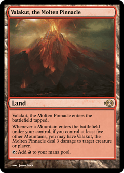 This land enters tapped. Whenever a Mountain you control enters, if you control at least five other Mountains, you may have this land deal 3 damage to any target. {T}: Add {R}.