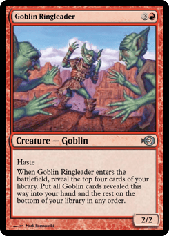 Haste (This creature can attack and {T} as soon as it comes under your control.) When this creature enters, reveal the top four cards of your library. Put all Goblin cards revealed this way into your hand and the rest on the bottom of your library in any order.
