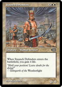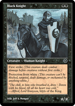 First strike (This creature deals combat damage before creatures without first strike.) Protection from black (This creature can't be blocked, targeted, dealt damage, or enchanted by anything black.)