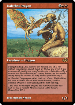 Flying; banding (Any creatures with banding, and up to one without, can attack in a band. Bands are blocked as a group. If any creatures with banding you control are blocking or being blocked by a creature, you divide that creature's combat damage, not its controller, among any of the creatures it's being blocked by or is blocking.) {R}: This creature gets +1/+0 until end of turn. If this ability has been activated four or more times this turn, sacrifice this creature at the beginning of the next end step.