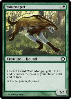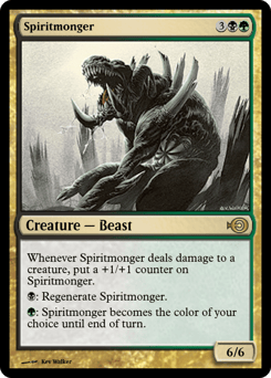 Whenever this creature deals damage to a creature, put a +1/+1 counter on this creature. {B}: Regenerate this creature. {G}: This creature becomes the color of your choice until end of turn.