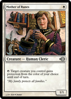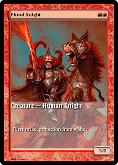 First strike (This creature deals combat damage before creatures without first strike.) Protection from white (This creature can't be blocked, targeted, dealt damage, or enchanted by anything white.)
