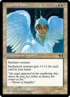 Enchant creature Enchanted creature gets +1/+1 for each card in your hand.