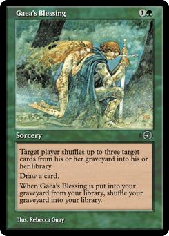 Target player shuffles up to three target cards from their graveyard into their library. Draw a card. When this card is put into your graveyard from your library, shuffle your graveyard into your library.
