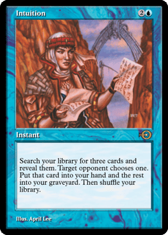 Search your library for three cards and reveal them. Target opponent chooses one. Put that card into your hand and the rest into your graveyard. Then shuffle.