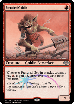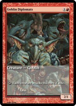 Other Goblin creatures you control attack each combat if able. At the beginning of combat on your turn, create a 1/1 red Goblin creature token with haste. Whenever this creature attacks, it gets +1/+0 until end of turn for each other attacking Goblin.