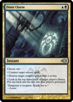 Choose one — • Counter target sorcery spell. • Destroy target creature with power 2 or less. • Look at the top three cards of target player's library. Put one back and the rest into that player's graveyard.