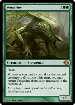 Haste Whenever you cast a spell, if it's the second creature spell you cast this turn, you may return this card from your graveyard to the battlefield.