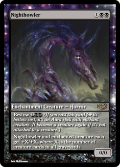 Bestow {2}{B}{B} (If you cast this card for its bestow cost, it's an Aura spell with enchant creature. It becomes a creature again if it's not attached to a creature.) This creature and enchanted creature each get +X/+X, where X is the number of creature cards in all graveyards.