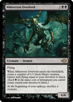 Flying When this creature enters, create a number of 1/1 black Harpy creature tokens with flying equal to your devotion to black. (Each {B} in the mana costs of permanents you control counts toward your devotion to black.) At the beginning of your upkeep, sacrifice a creature.