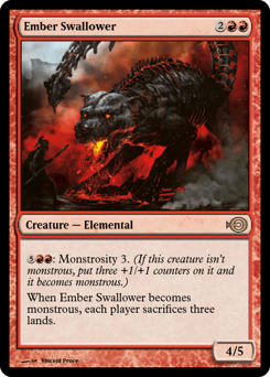 {5}{R}{R}: Monstrosity 3. (If this creature isn't monstrous, put three +1/+1 counters on it and it becomes monstrous.) When this creature becomes monstrous, each player sacrifices three lands of their choice.