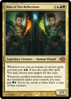 Whenever you cast an instant or sorcery spell, you may pay {U}{R}. If you do, copy that spell. You may choose new targets for the copy. Whenever another nontoken creature you control enters, you may pay {G}{U}. If you do, create a token that's a copy of that creature.