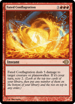 Fated Conflagration deals 5 damage to target creature or planeswalker. If it's your turn, scry 2.