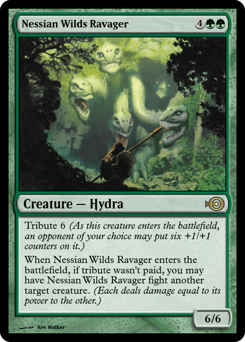Tribute 6 (As this creature enters, an opponent of your choice may put six +1/+1 counters on it.) When this creature enters, if tribute wasn't paid, you may have this creature fight another target creature. (Each deals damage equal to its power to the other.)
