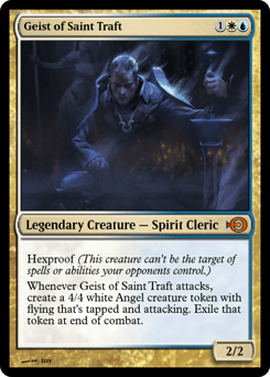 Hexproof (This creature can't be the target of spells or abilities your opponents control.) Whenever Geist of Saint Traft attacks, create a 4/4 white Angel creature token with flying that's tapped and attacking. Exile that token at end of combat.