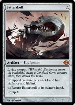 Living weapon (When this Equipment enters, create a 0/0 black Phyrexian Germ creature token, then attach this to it.) Equipped creature gets +4/+4 and has vigilance and lifelink. {3}: Return this Equipment to its owner's hand. Equip {5}