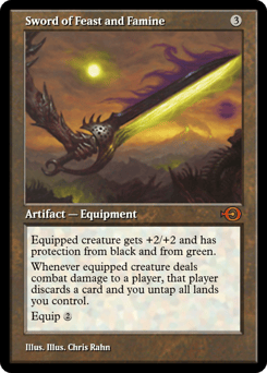 Equipped creature gets +2/+2 and has protection from black and from green. Whenever equipped creature deals combat damage to a player, that player discards a card and you untap all lands you control. Equip {2}
