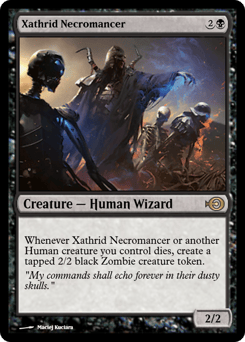 Whenever this creature or another Human creature you control dies, create a tapped 2/2 black Zombie creature token.