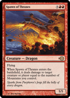 Flying When this creature enters, it deals damage to any target equal to the number of Mountains you control.