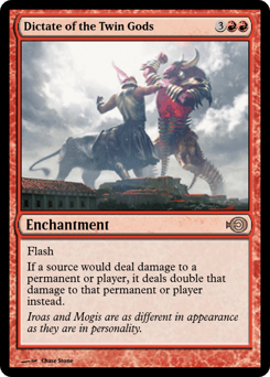 Flash If a source would deal damage to a permanent or player, it deals double that damage to that permanent or player instead.