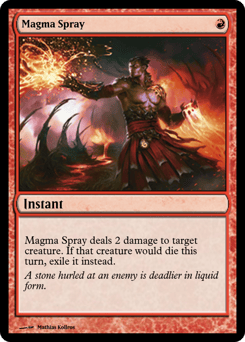 Magma Spray deals 2 damage to target creature. If that creature would die this turn, exile it instead.
