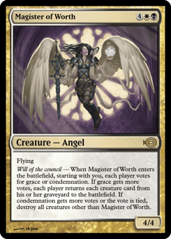 Flying Will of the council — When this creature enters, starting with you, each player votes for grace or condemnation. If grace gets more votes, each player returns each creature card from their graveyard to the battlefield. If condemnation gets more votes or the vote is tied, destroy all creatures other than this creature.