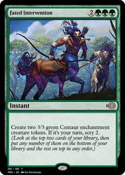 Create two 3/3 green Centaur enchantment creature tokens. If it's your turn, scry 2.