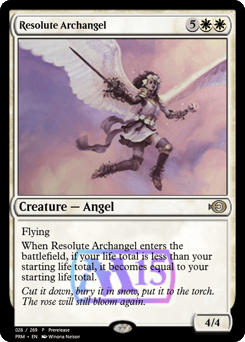 Flying When this creature enters, if your life total is less than your starting life total, it becomes equal to your starting life total.