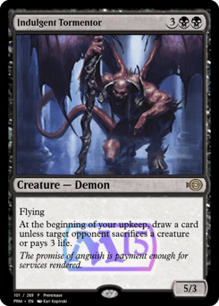Flying At the beginning of your upkeep, draw a card unless target opponent sacrifices a creature of their choice or pays 3 life.