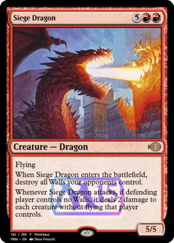Flying When this creature enters, destroy all Walls your opponents control. Whenever this creature attacks, if defending player controls no Walls, it deals 2 damage to each creature without flying that player controls.