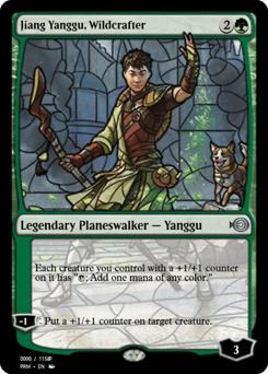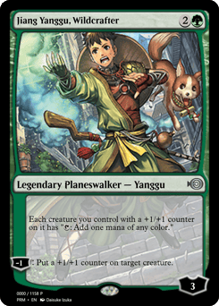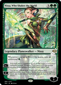 Whenever you tap a Forest for mana, add an additional {G}. [+1]: Put three +1/+1 counters on up to one target noncreature land you control. Untap it. It becomes a 0/0 Elemental creature with vigilance and haste that's still a land. [−8]: You get an emblem with "Lands you control have indestructible." Search your library for any number of Forest cards, put them onto the battlefield tapped, then shuffle.