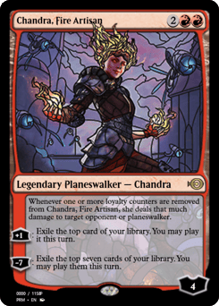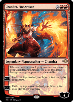 Whenever one or more loyalty counters are removed from Chandra, she deals that much damage to target opponent or planeswalker. [+1]: Exile the top card of your library. You may play it this turn. [−7]: Exile the top seven cards of your library. You may play them this turn.