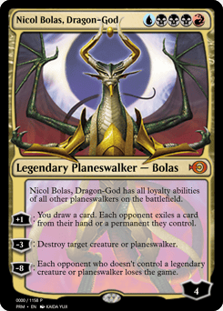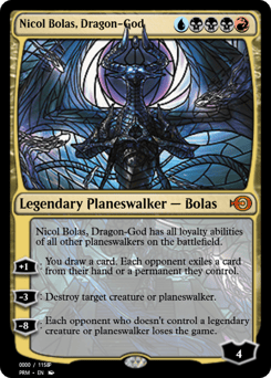 Nicol Bolas has all loyalty abilities of all other planeswalkers on the battlefield. [+1]: You draw a card. Each opponent exiles a card from their hand or a permanent they control. [−3]: Destroy target creature or planeswalker. [−8]: Each opponent who doesn't control a legendary creature or planeswalker loses the game.
